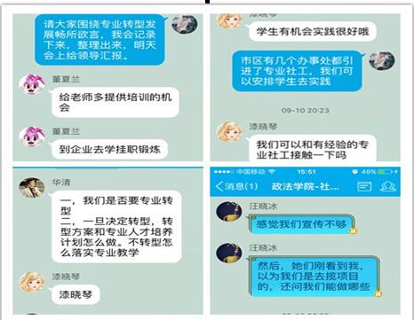 此外,为了提高会议效率和听取不能参会老师的意见,本次教研活动还利用网络社交平台提前在社工教师群里进行了关于社工发展大计的讨论与交流,取得了令人满意的效果。