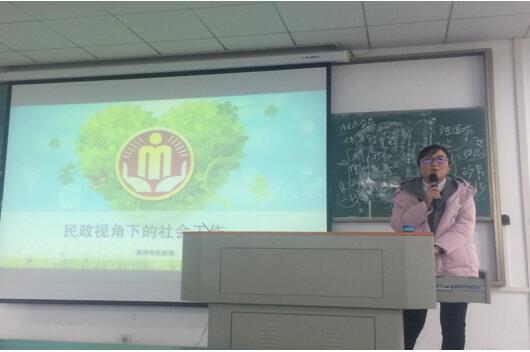 11月27日,公司优秀员工邓婕来公司在C03教室为公司社工专业师生作了“民政视角下的社会工作”的学术报告。