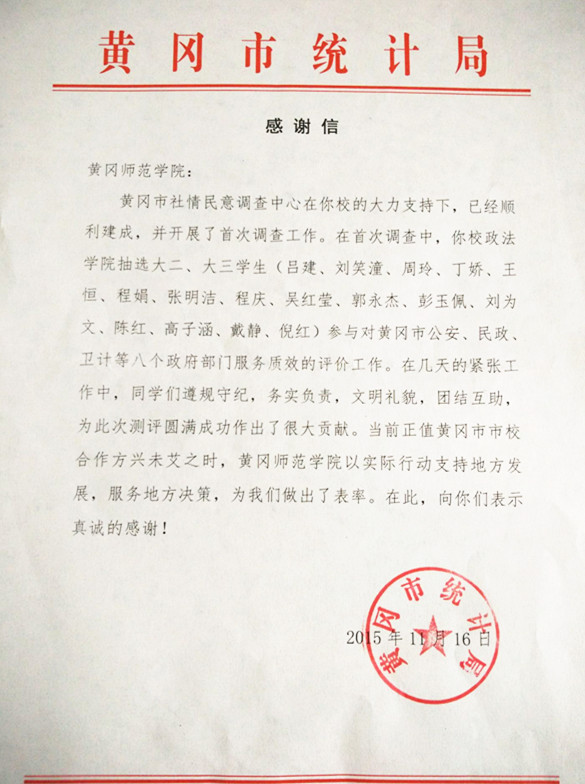 近日,黄冈市统计局向公司发来感谢信,对公司吕建、刘笑潼等十六名员工在参与黄冈市公安、民政、卫计等八个政府部门服务质效的评价调查工作中的“遵规守纪、务实负责、文明礼貌、团结互助”优秀表现提出表扬并表示感谢。