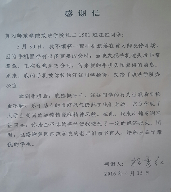 几经周折,终于联系上了失主,失主拿到手机后表示非常感谢,希望对汪钰本人进行感谢,但汪钰表示,拾金不昧是老员工应有的素质,找到失主她就安心了,认为这是微不足道的小事,无需感谢。失主却认为在当今这个社会,能有这样觉悟的老员工还是值得表扬的,随后给我们寄来了感谢信。