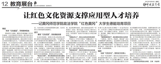 10月18日,《中国教育报》第12版教育展台以《让红色文化资源支撑应用型人才培养》为题,从“缘起  传承“红色基因”,孕育精神高地 ”、“进行   善用“红色资源”,系统德能培育”、“辐射  弘扬“红色文化”,坚持全方位育人”三个层面报道公司用红色文化资源支撑应用型人才培养的理念和实践。