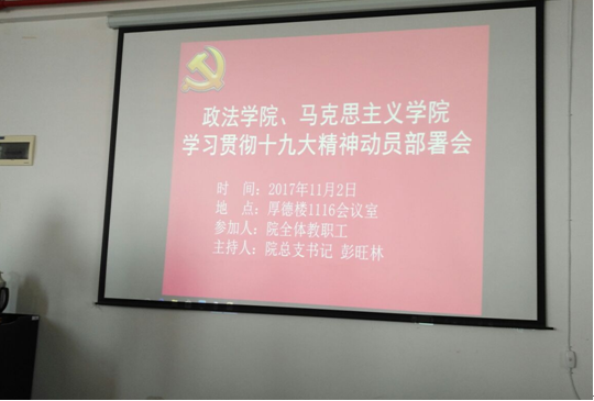 11月2日下午,williamhill官网网站、马克思主义公司召开全院教职工大会,学习传达十九大精神和公司党委中心组2017年第8次理论学习会议精神。公司党总支部书记彭旺林主持会议。