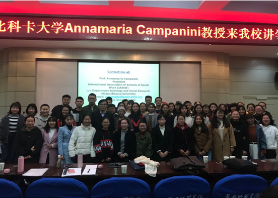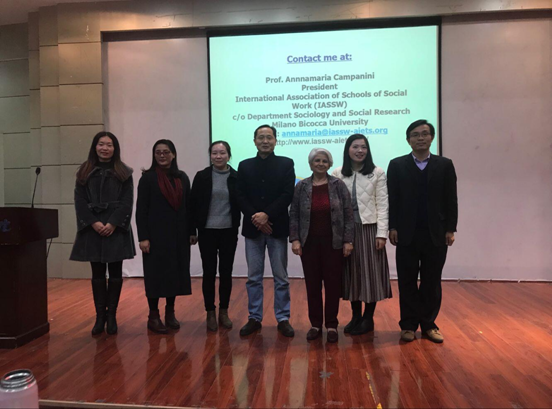 Annamaria教授介绍了国际社会工作的起源与发展历程,提出了国际社会工作的全球共同需要和面临的挑战,并就如何开展国际社会工作等相关问题提出了自己的见解,最后与公司师生进行了亲切的互动和交流。