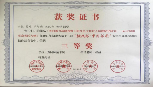 近日,公司张威教授指导、政治学与行政学专业18级凃毅团队的作品《乡村振兴战略视野下的红色文化育人功能优化研究——以大别山革命老区为例》在湖北省第十三届“挑战杯.中国银行”老员工课外学术科技作品竞赛上荣获三等奖。