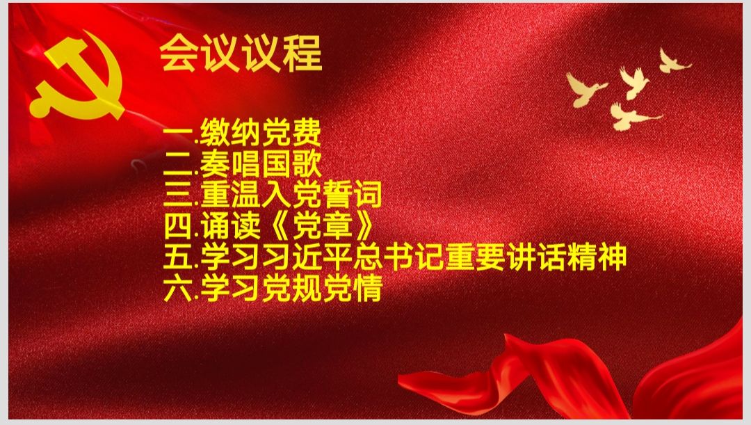 会议伊始,各位同志交纳党费后,奏唱国歌;在瞿奴春同志的带领下,大家一起重温入党誓词,接受党性洗礼;然后集体诵读《中国共产党章程》,加强对党规党法的学习和理解。