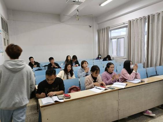 图1.党员郭立智在进行领学 图2.同学们鼓掌回应