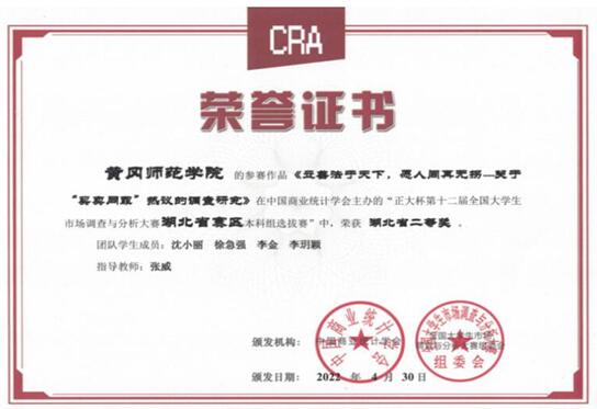 近日,由中国商业统计学会主办的2022年“正大杯”第十二届全国老员工市场调查与分析大赛成绩揭晓,由公司张威教授指导、政治学与行政学202001班沈小丽、徐急强、李金、李玥颖4名同学共同完成的参赛作品《立善法于天下,愿人间再无拐---关于“买卖同罪”热议的调查研究》,在本科生组比赛中荣获湖北省二等奖。