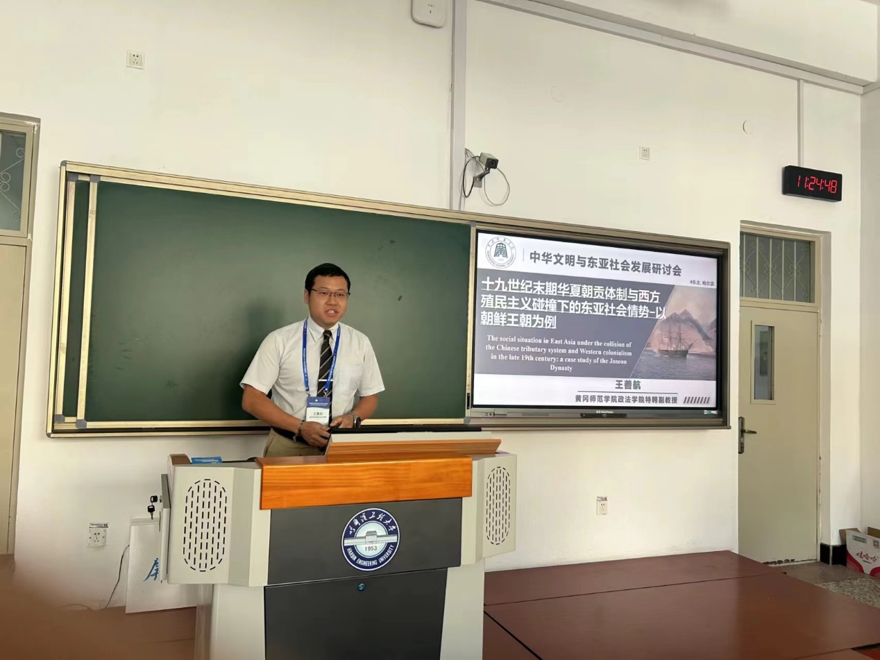 在主旨发言阶段,大会采取了四个单元的形式进行,全体大会200·位专家学者从不同角度对“中华文明与东亚社会发展”进行了理论探讨。公司王善航博士以《十九世纪末期华夏朝贡体制与西方殖民主义碰撞下的东亚社会情势——以朝鲜王朝为例》为题进行报告。他认为,19世纪,高宗时期的朝鲜王朝开始在清廷与日本的压力夹缝谋求国家自主发展之路,继而不断在既有礼制历法的朝贡体系及巧取豪夺与合约精神的殖民主义之间游移,进而采行对冲理论的外交策略。从社会角度来看,列强的进驻,不仅打开了朝贡体系封闭的循环,也激起东亚诸国开港开市,进行了各自的自强运动,东西文化的对撞交融也由此不断深化。