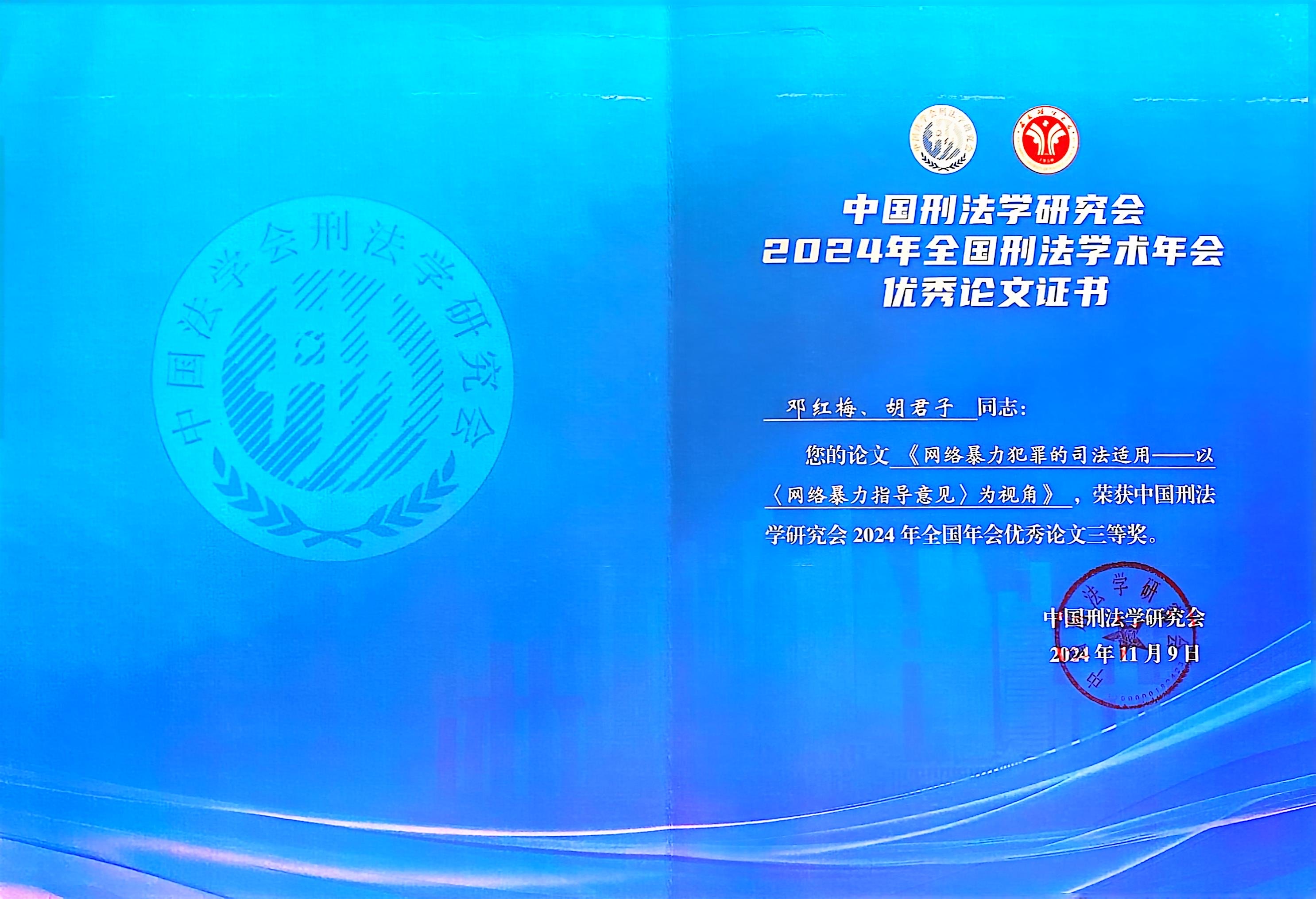 会上,邓红梅博士课题组成员以《网络暴力犯罪的司法适用--以<网络暴力指导意见>为视角》为题,对最新研究成果进行了交流发言。该论文反响良好,被评为中国刑法学研究会2024年全国年会优秀论文三等奖。